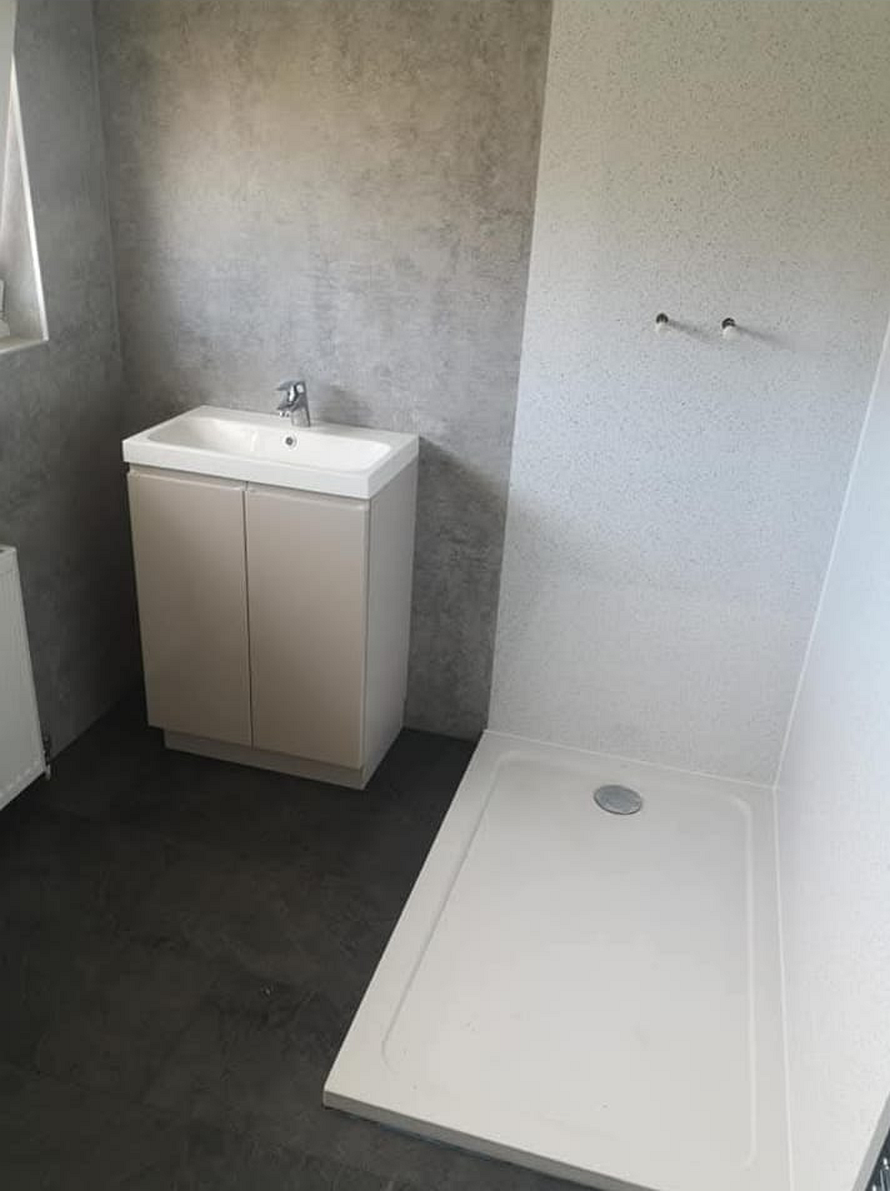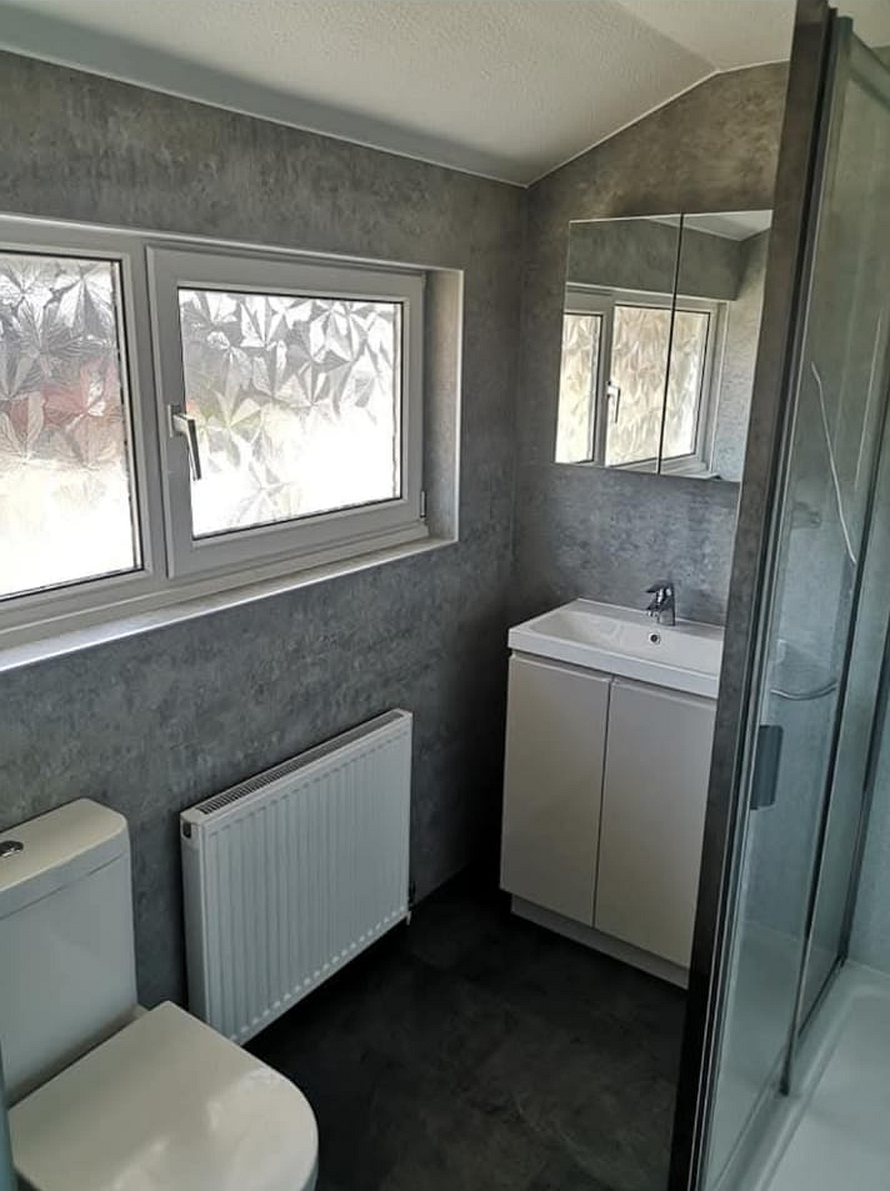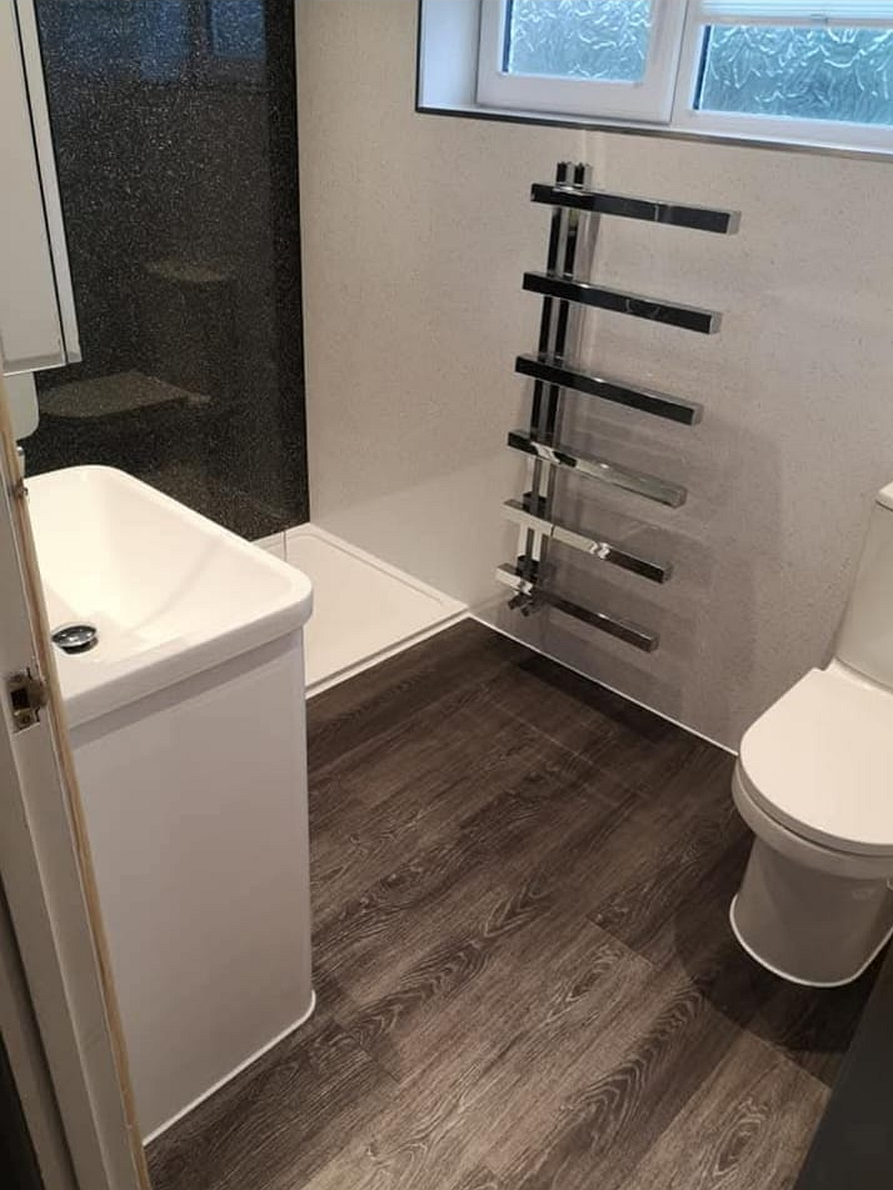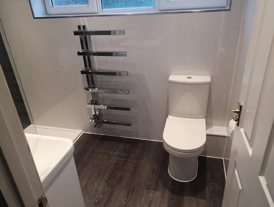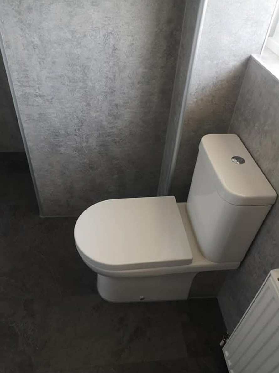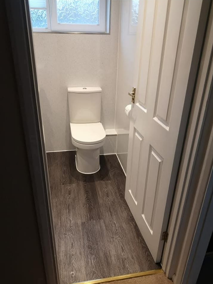 A complete new bathroom installed with a full room, wall-boarded ‘tongue and groove’ multi-panel boards: these are waterproof, easy-clean and give a seamless finish click. To finish the we installed flooring: 100% rubber and hard wearing for long lasting use