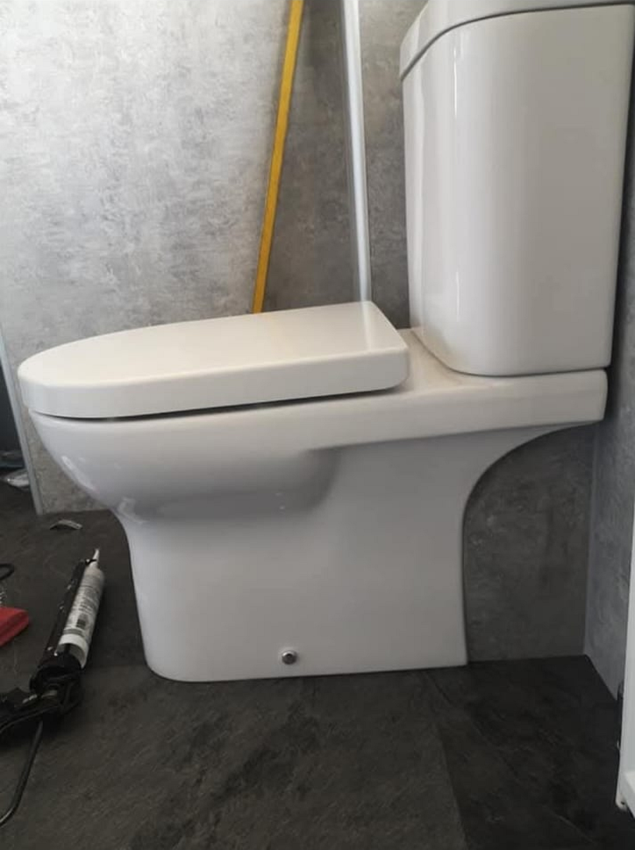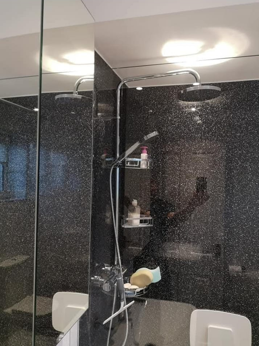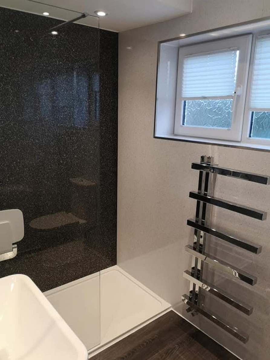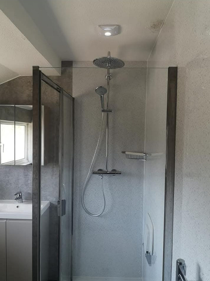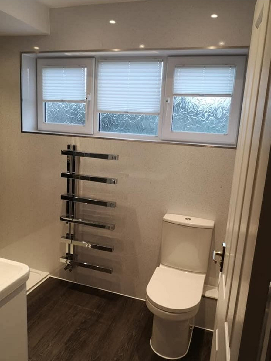 A complete new bathroom installed with a full room, wall-boarded ‘tongue and groove’ multi-panel boards: these are waterproof, easy-clean and give a seamless finish click. To finish the we installed flooring: 100% rubber and hard wearing for long lasting use