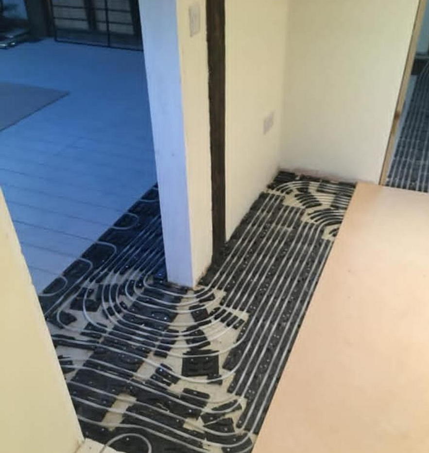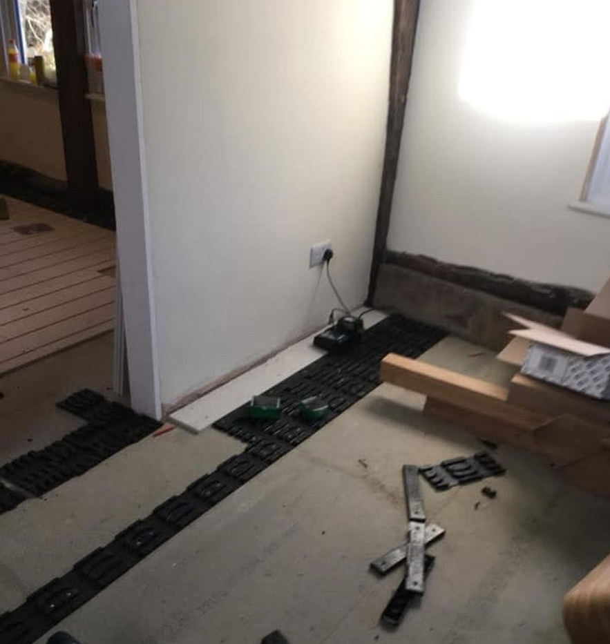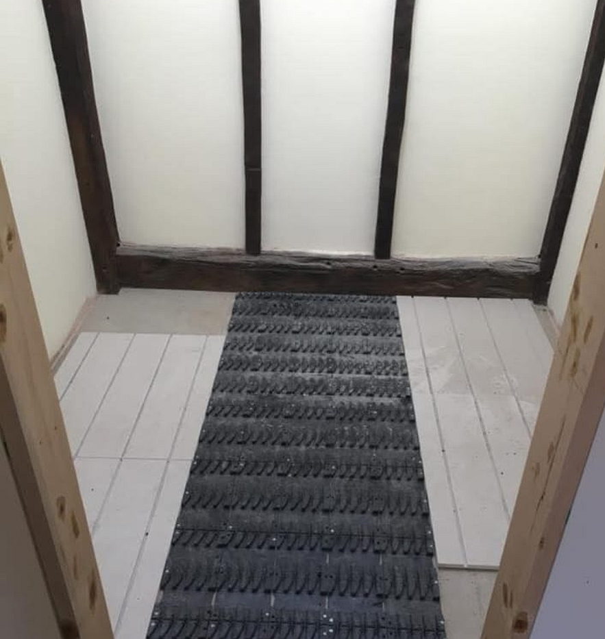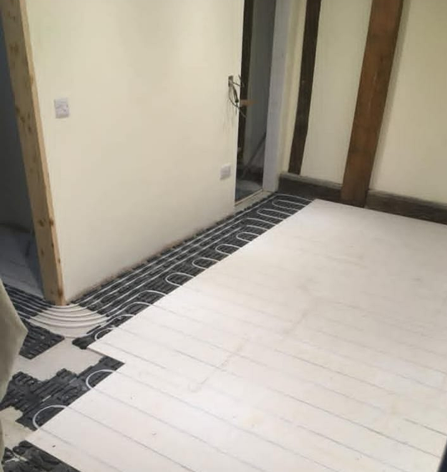 With this underfloor heating system for a first floor of a barn conversion with height restrictions we employed a low-lever, routed-concrete board system to take from subfloor to finished floor with as little built up as 20mm from subfloor to finished floor. This can be covered with tiles carpet and hard flooring
